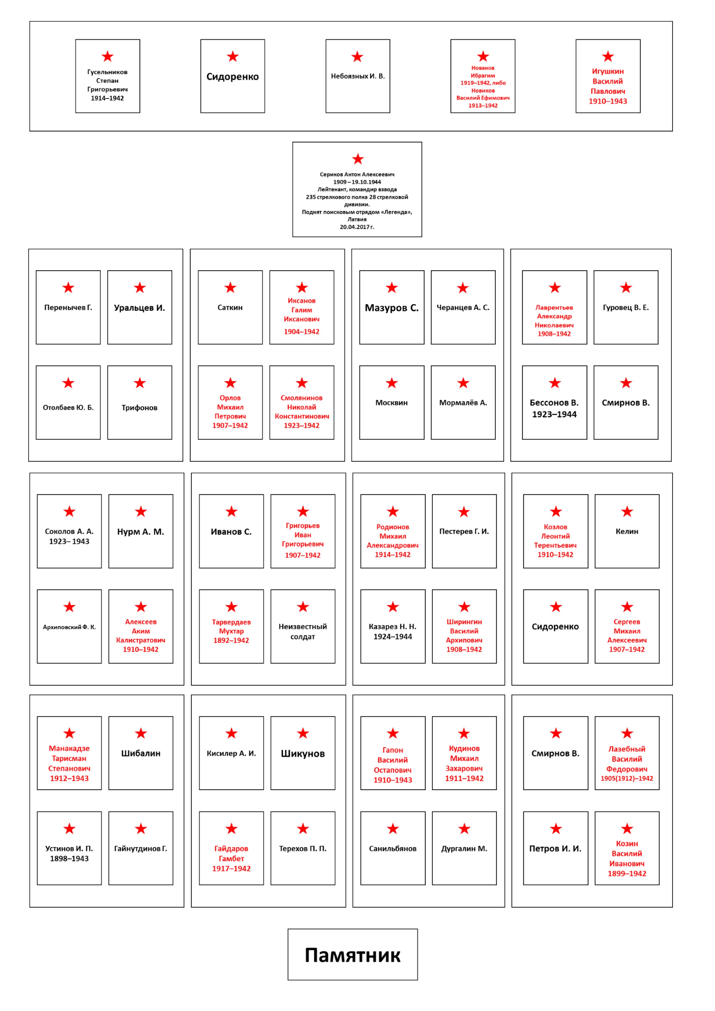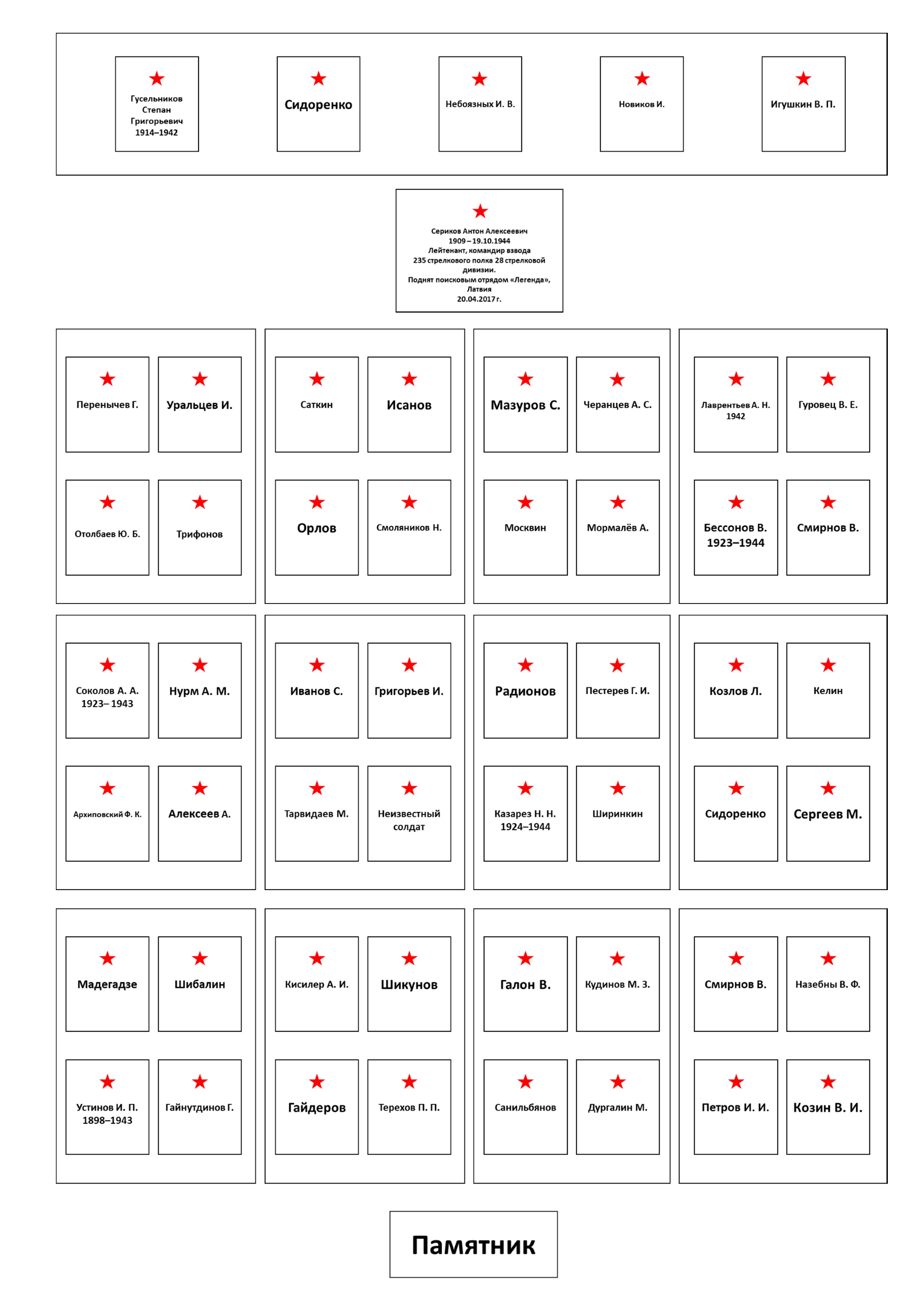 План воинского захоронения с указанием существующих надписей на могилах и с уточнением существующих надписей на могилах