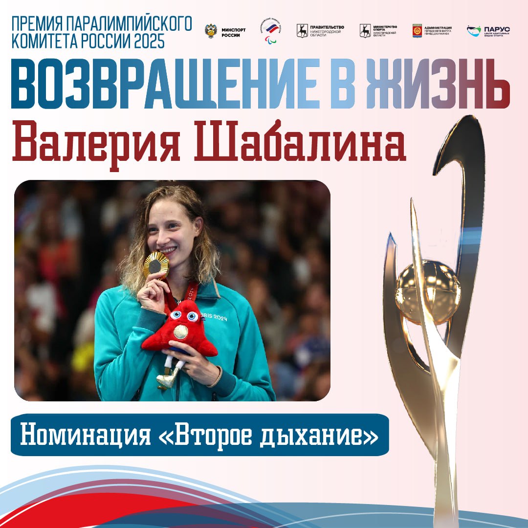 Валерия Шабалина, пятикратная паралимпийская чемпионка, заслуженный мастер спорта по плаванию, стала лауреатом премии Паралимпийского комитета России «Возвращение в жизнь» в номинации «Второе дыхание». Церемония вручения премии состоялась 2 декабря в Москве.